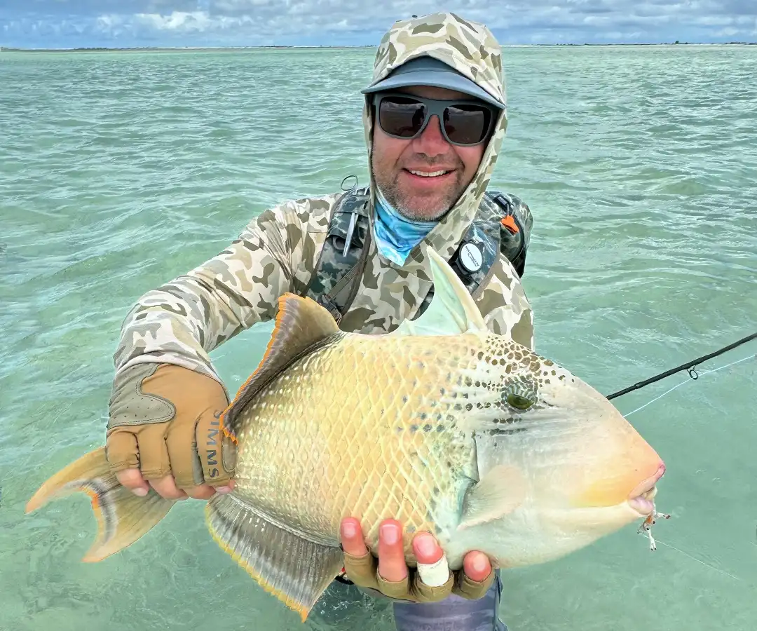 The ideal cast is about five feet beyond and five feet in front of the trigger. Make sure the current and wind will push your fly towards your target. Usually, you'll want to take short, hard strips of just a few inches to avoid spooking them. If you are lucky enough to hook a triggerfish without its teeth destroying the hook or tippet, then hang on as the fun begins!